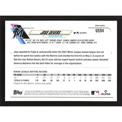 This is a 2021 Topps Update Jose Devers autographed baseball card. This card has been signed, in blue, by Jose Devers, and is guaranteed authentic by Ballcardz.com. The card is #US94 and pictures show condition.