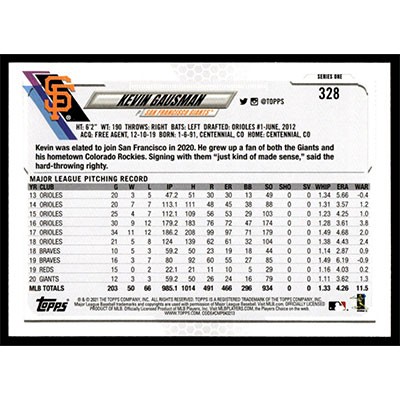 This is a 2021 Topps Wal-Mart Royal Blue Kevin Gausman baseball card. The card is #328 and pictures show condition.