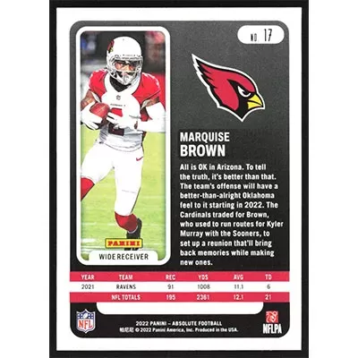 This is a 2022 Absolute Marquise Brown football card. The card is #17 and pictures show condition.