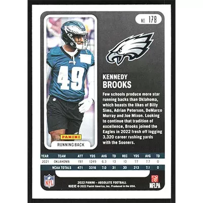 This is a 2022 Absolute Kennedy Brooks football card. The card is #178 and pictures show condition.