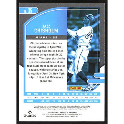 This is a 2022 Absolute Jazz Chisholm baseball card. The card is #35 and pictures show condition.