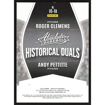 This is a 2022 Absolute Historical Duals Retail Green Roger Clemens and Andy Pettitte baseball card. The card is #HD-RA and pictures show condition. Team(s): Houston Astros