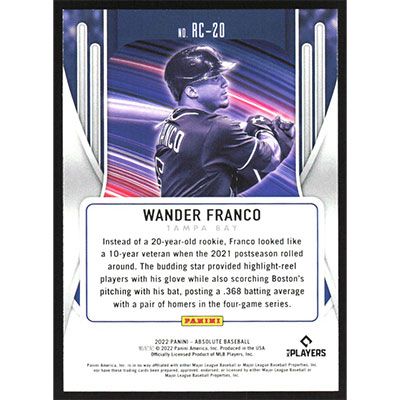 This is a 2022 Absolute Rookie Class Wander Franco baseball card. The card is #RC-20 and pictures show condition.
