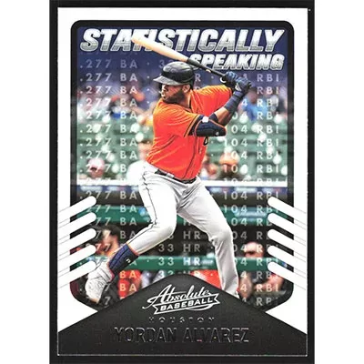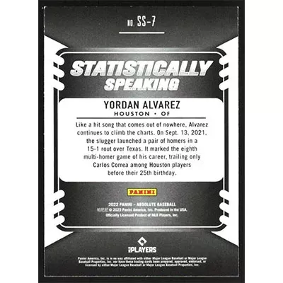This is a 2022 Absolute Statistically Speaking Yordan Alvarez baseball card. The card is #SS-7 and pictures show condition.