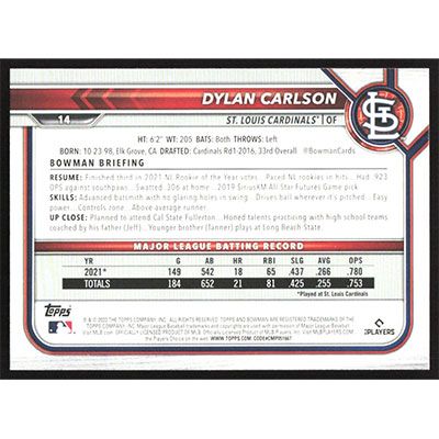 This is a 2022 Bowman Dylan Carlson baseball card. The card is #14 and pictures show condition.
