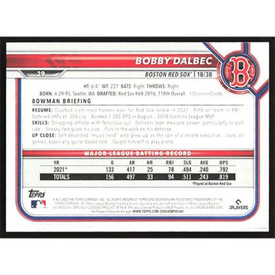 This is a 2022 Bowman Bobby Dalbec baseball card. The card is #29 and pictures show condition.