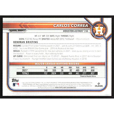 This is a 2022 Bowman Carlos Correa baseball card. The card is #3 and pictures show condition.