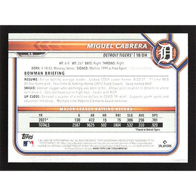 This is a 2022 Bowman Miguel Cabrera baseball card. The card is #50 and pictures show condition.