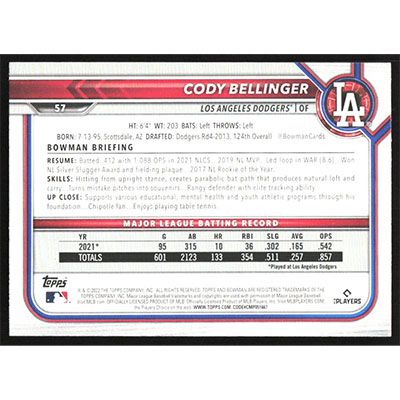 This is a 2022 Bowman Cody Bellinger baseball card. The card is #57 and pictures show condition.