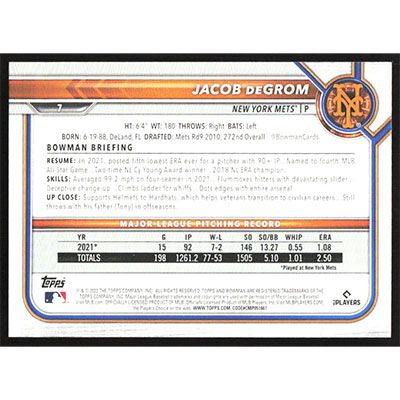This is a 2022 Bowman Jacob deGrom baseball card. The card is #7 and pictures show condition.