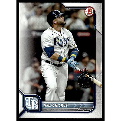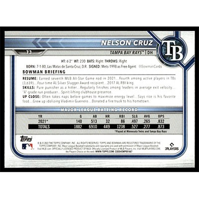 This is a 2022 Bowman Nelson Cruz 2025 Originals Holiday Buyback baseball card. The card is #73 and pictures show condition.