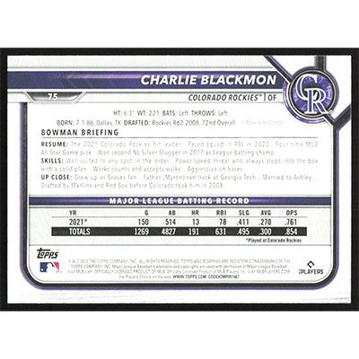 This is a 2022 Bowman Charlie Blackmon baseball card. The card is #75 and pictures show condition.