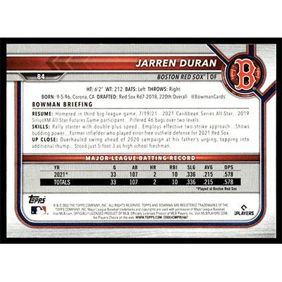This is a 2022 Bowman Jarren Duran baseball card. The card is #84 and pictures show condition.