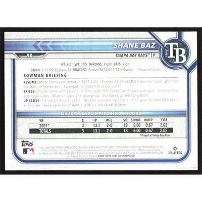 This is a 2022 Bowman Shane Baz baseball card. The card is #90 and pictures show condition.