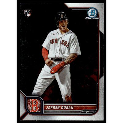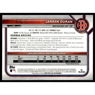 This is a 2022 Bowman Chrome Jarren Duran baseball card. The card is #16 and pictures show condition.