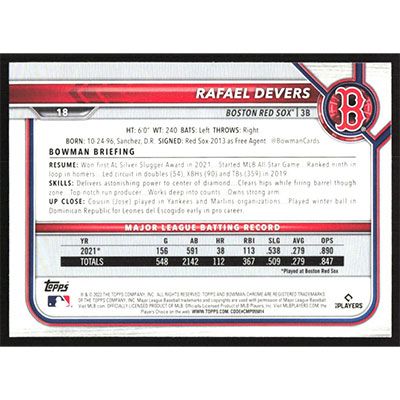 This is a 2022 Bowman Chrome Rafael Devers baseball card. The card is #18 and pictures show condition.