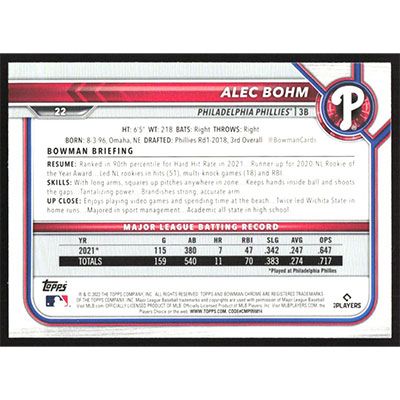 This is a 2022 Bowman Chrome Alec Bohm baseball card. The card is #22 and pictures show condition.