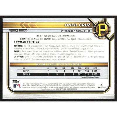 This is a 2022 Bowman Chrome Oneil Cruz baseball card. The card is #45 and pictures show condition.