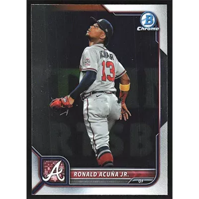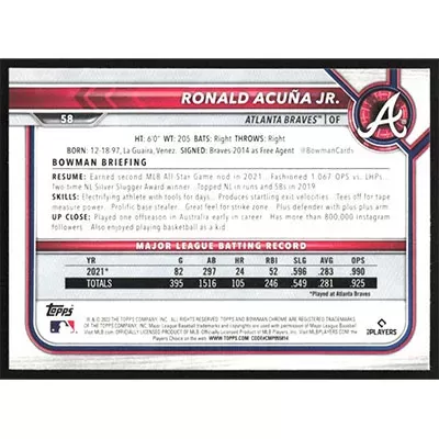 This is a 2022 Bowman Chrome Ronald Acuña Jr. baseball card. The card is #58 and pictures show condition.