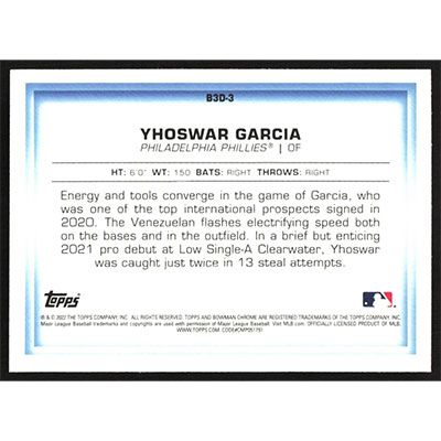 This is a 2022 Bowman Chrome Bowman in 3-D Yhoswar Garcia baseball card. The card is #B3D-3 and pictures show condition.