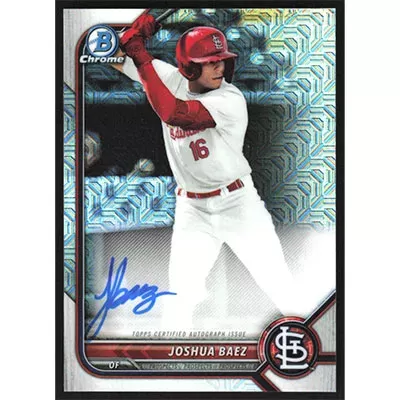 This is a 2022 Bowman Chrome Mega Box Autographs Joshua Baez autographed baseball card. This card has been signed, in blue, by Joshua Baez, and is certified authentic by Topps. The card is #BMA-JB and pictures show condition.