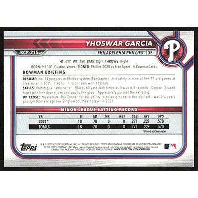 This is a 2022 Bowman Chrome Mega Box Prospects Yhoswar Garcia baseball card. The card is #BCP-215 and pictures show condition. Team(s): Philadelphia Phillies