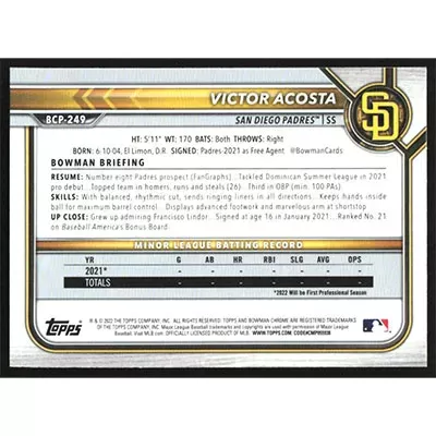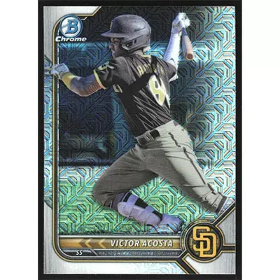 This is a 2022 Bowman Chrome Mega Box Prospects Victor Acosta baseball card. The card is #BCP-249 and pictures show condition.