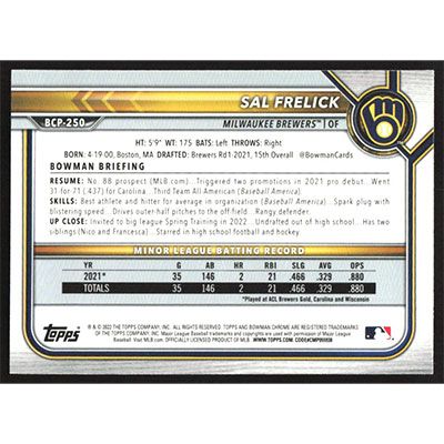 This is a 2022 Bowman Chrome Mega Box Prospects Sal Frelick baseball card. The card is #BCP-250 and pictures show condition.