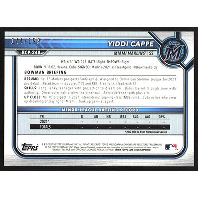 This is a 2022 Bowman Chrome Mega Box Prospects Pink Refractors Yiddi Cappe baseball card. The card is #BCP-248 and pictures show condition. This card is limited; #'d 144/199.