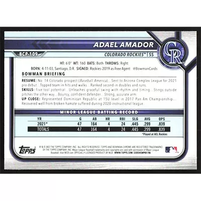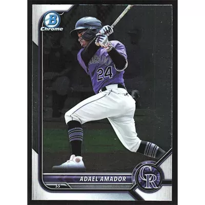 This is a 2022 Bowman Chrome Prospects Adael Amador baseball card. The card is #BCP-109 and pictures show condition.