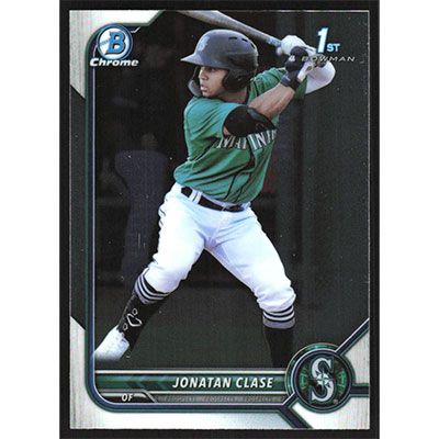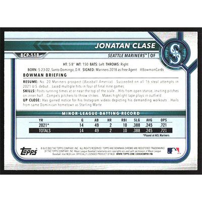 This is a 2022 Bowman Chrome Prospects Jonatan Clase baseball card. The card is #BCP-118 and pictures show condition.