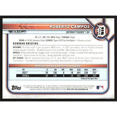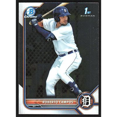 This is a 2022 Bowman Chrome Prospects Roberto Campos baseball card. The card is #BCP-14 and pictures show condition.
