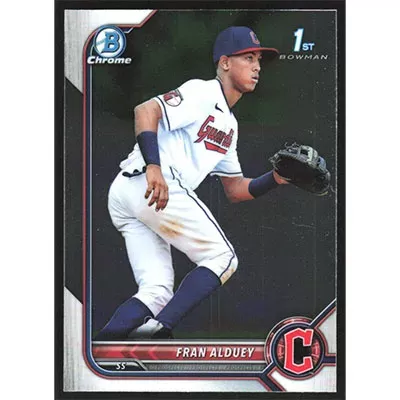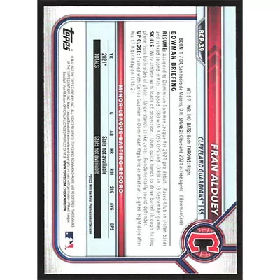 This is a 2022 Bowman Chrome Prospects Fran Alduey baseball card. The card is #BCP-39 and pictures show condition.