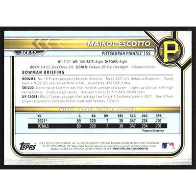 This is a 2022 Bowman Chrome Prospects Maikol Escotto baseball card. The card is #BCP-52 and pictures show condition.