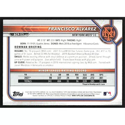 This is a 2022 Bowman Chrome Prospects Francisco Alvarez baseball card. The card is #BCP-53 and pictures show condition.