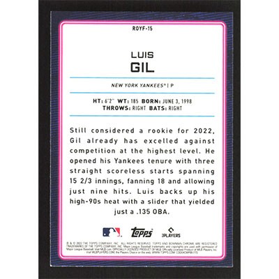 This is a 2022 Bowman Chrome Rookie of the Year Favorites Luis Gil baseball card. The card is #ROYF-15 and pictures show condition. Team(s): New York Yankees Rookie Card (RC)