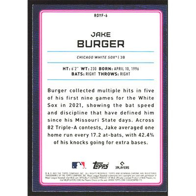 This is a 2022 Bowman Chrome Rookie of the Year Favorites Jake Burger baseball card. The card is #ROYF-6 and pictures show condition. Team(s): Chicago White Sox Rookie Card (RC)
