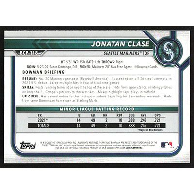 This is a 2022 Bowman Chrome Sapphire Prospects Jonatan Clase baseball card. The card is #BCP-118 and pictures show condition.