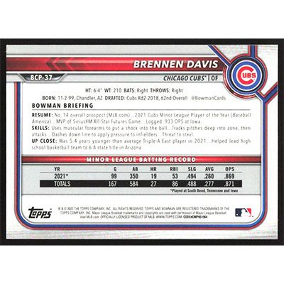 This is a 2022 Bowman Chrome Sapphire Prospects Brennen Davis baseball card. The card is #BCP-37 and pictures show condition.