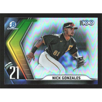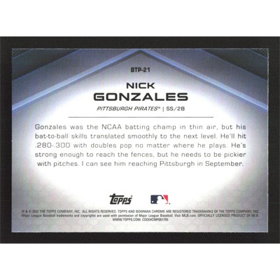 This is a 2022 Bowman Chrome Scouts Top 100 Nick Gonzales baseball card. The card is #BTP-21 and pictures show condition.