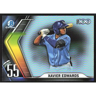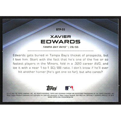This is a 2022 Bowman Chrome Scouts Top 100 Xavier Edwards baseball card. The card is #BTP-55 and pictures show condition.