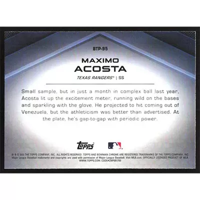This is a 2022 Bowman Chrome Scouts Top 100 Maximo Acosta baseball card. The card is #BTP-95 and pictures show condition.