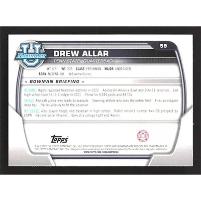 This is a 2022 Bowman Chrome University Drew Allar football card. The card is #59 and pictures show condition.