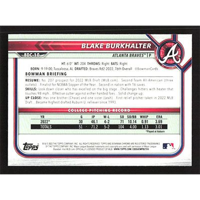 This is a 2022 Bowman Draft Chrome Blake Burkhalter autographed baseball card. This card has been signed, in blue, by Blake Burkhalter, and is guaranteed authentic by Ballcardz.com. The card is #BDC-10 and pictures show condition.