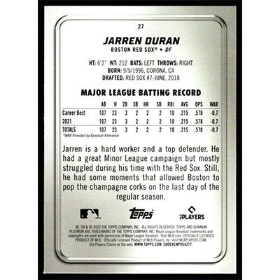 This is a 2022 Bowman Platinum Jarren Duran baseball card. The card is #27 and pictures show condition.