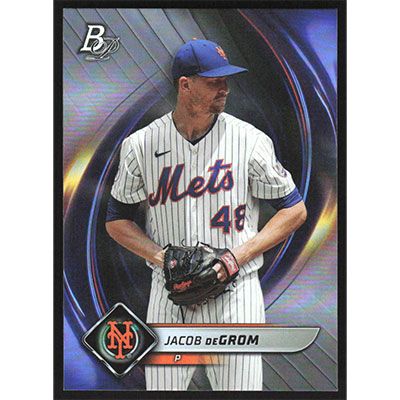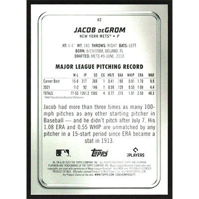 This is a 2022 Bowman Platinum Jacob deGrom baseball card. The card is #42 and pictures show condition.