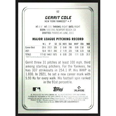 This is a 2022 Bowman Platinum Gerrit Cole baseball card. The card is #62 and pictures show condition.