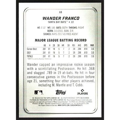 This is a 2022 Bowman Platinum Wander Franco baseball card. The card is #69 and pictures show condition.