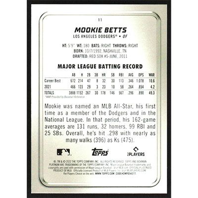This is a 2022 Bowman Platinum Ice Mookie Betts baseball card. The card is #11 and pictures show condition.