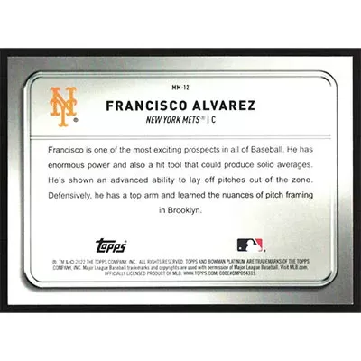 This is a 2022 Bowman Platinum Minted in Merit Francisco Alvarez baseball card. The card is #MM-12 and pictures show condition.